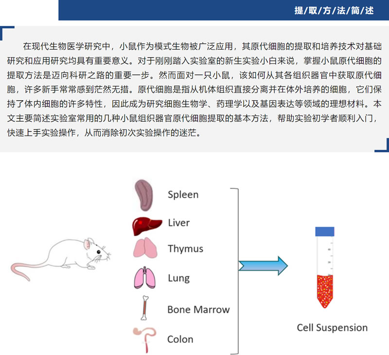 本文主要简述实验室常用的几种小鼠组织器官原代细胞提取的基本方法,帮助实验初学者顺利入门,快速上手实验操作,从而消除初次实验操作的迷茫。